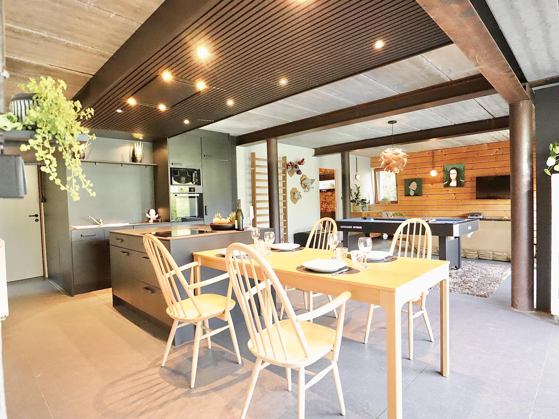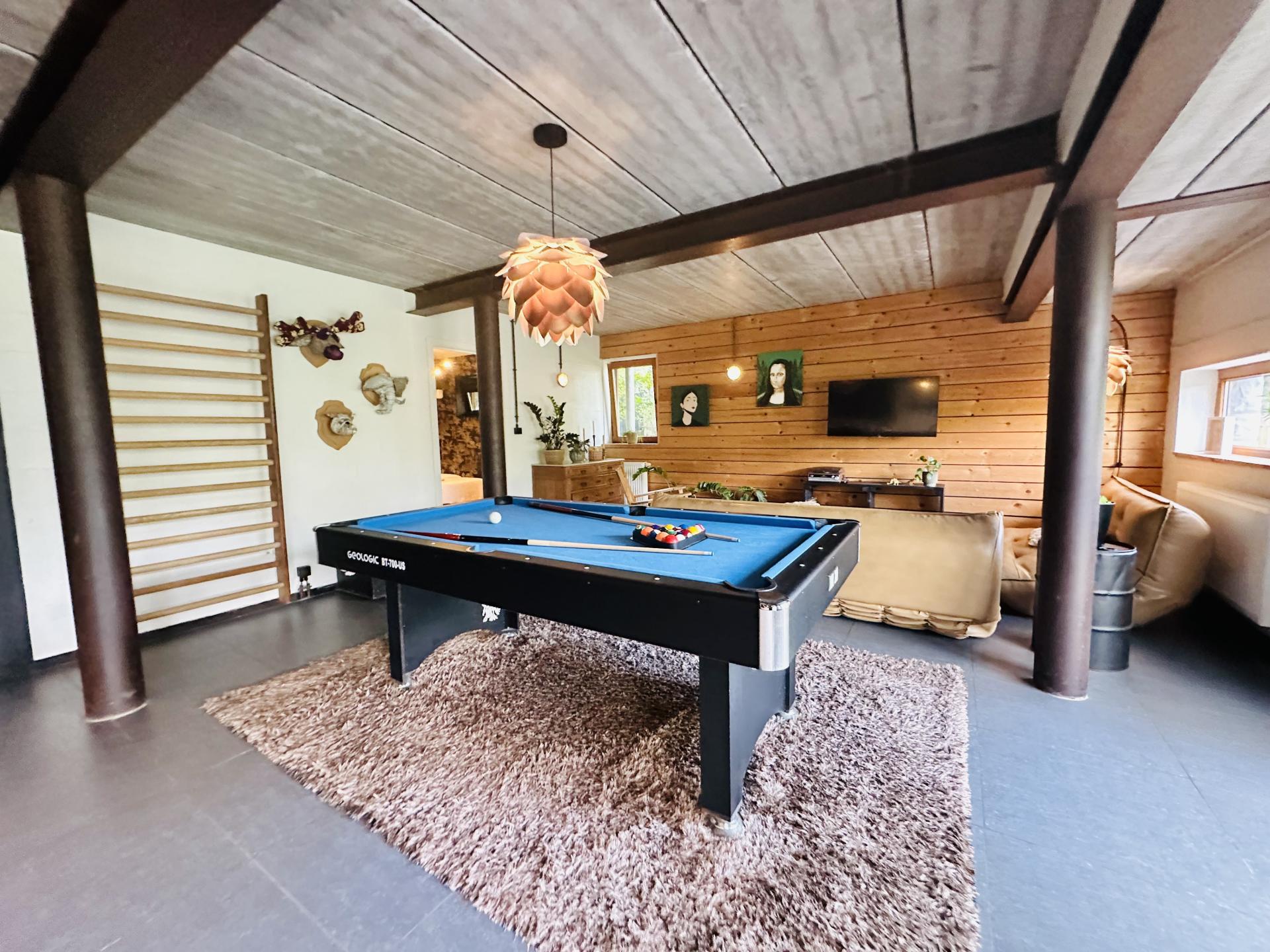 Das Ferienhaus umfasst außerdem einen schönen Wohnraum mit Wohnzimmer, offener Einbauküche, Esstisch und einem Billardtisch, an dem Sie sich vergnügen können. Zwei schöne Schlafzimmer mit Dusche, WC und Waschbecken.