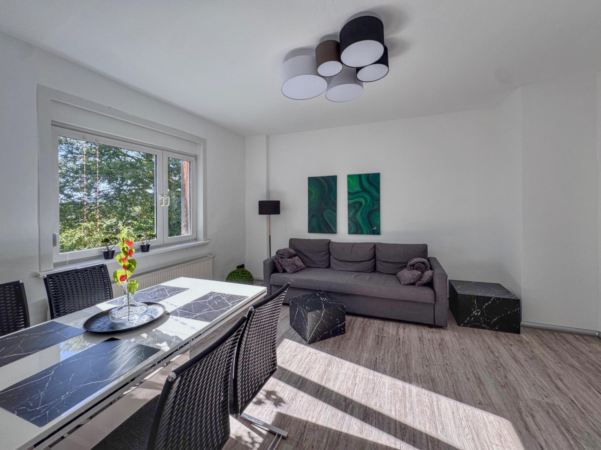Diese moderne Ferienwohnung liegt ruhig am Waldrand in Zella-Mehlis und ist ideal für Erholungssuchende. Die Unterkunft ist stilvoll eingerichtet und bietet alles für einen komfortablen Aufenthalt. Der großzügige Garten lädt mit mehreren Sitzgelegenheiten und Sonnenplätzen zum Verweilen ein, ein Grill sorgt für gemütliche Abende im Freien. Natur und Wanderwege liegen direkt vor der Tür, sodass Entspannung und Aktivitäten perfekt kombiniert werden können.