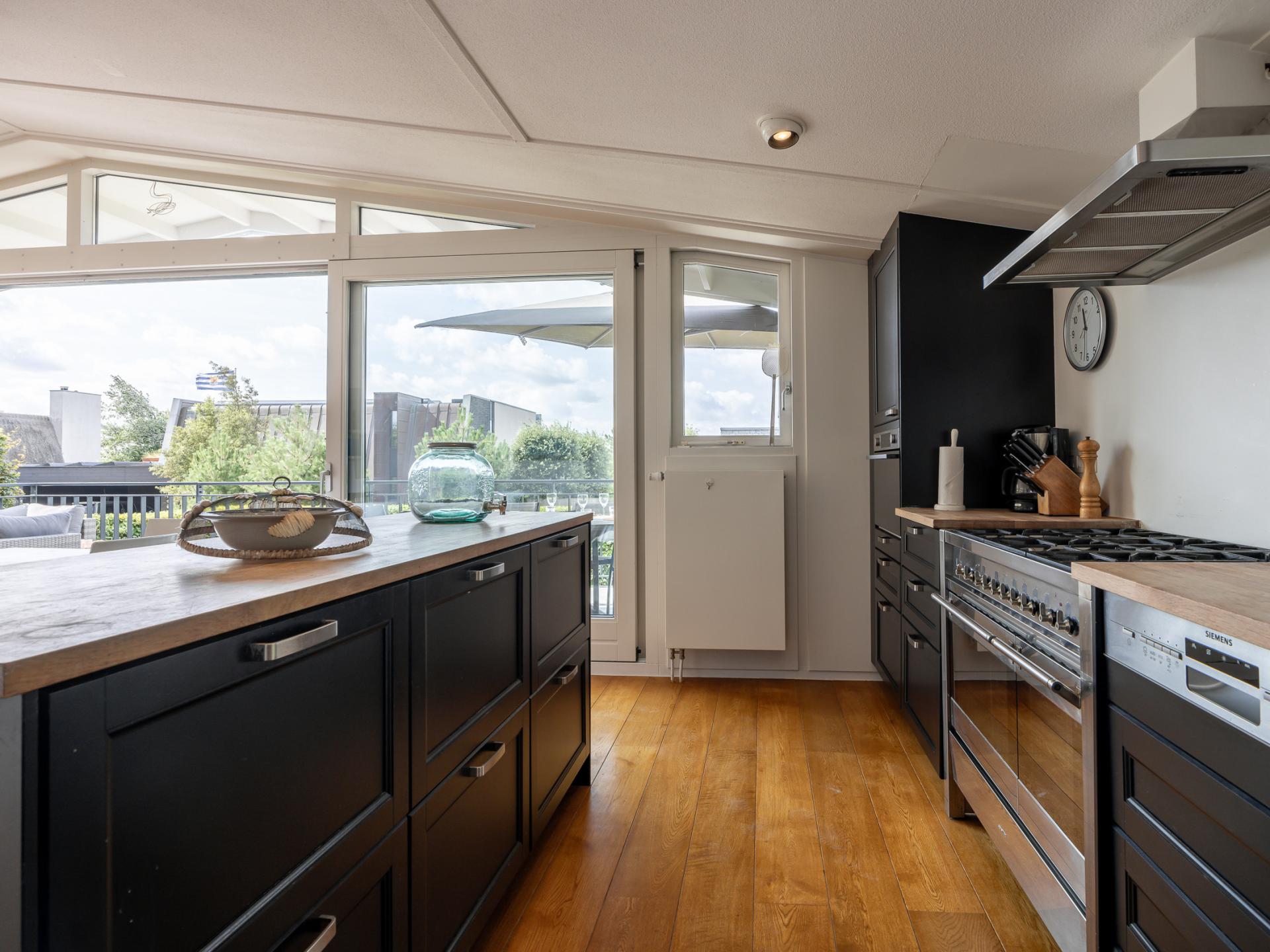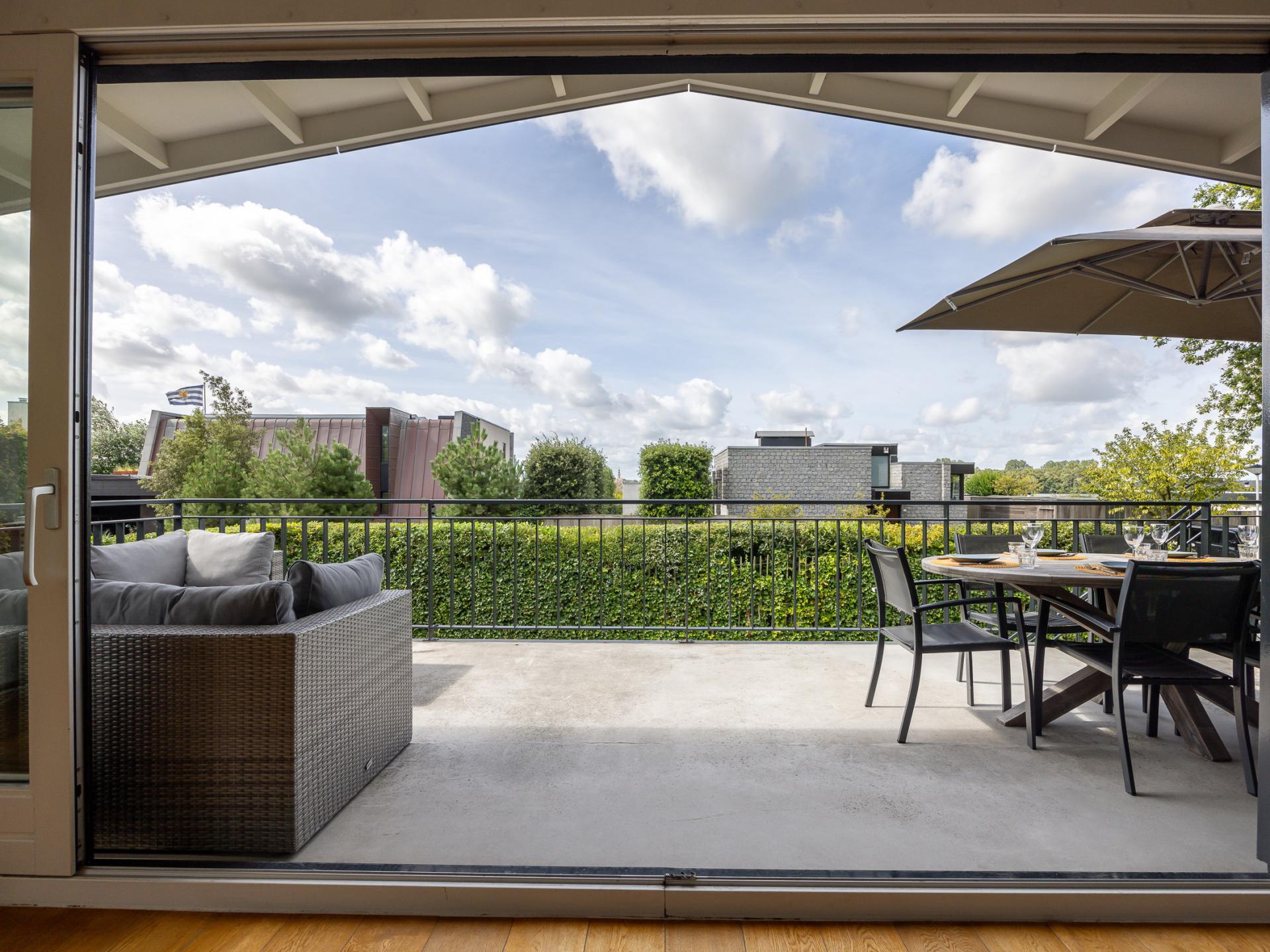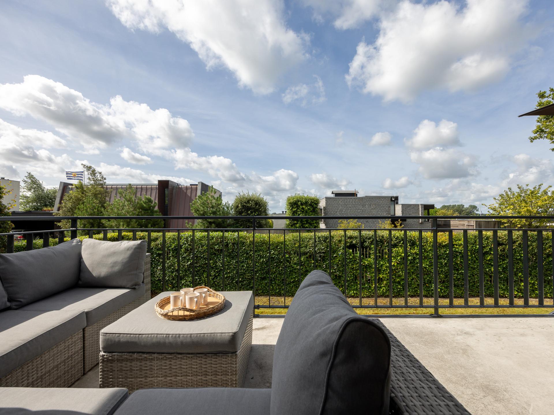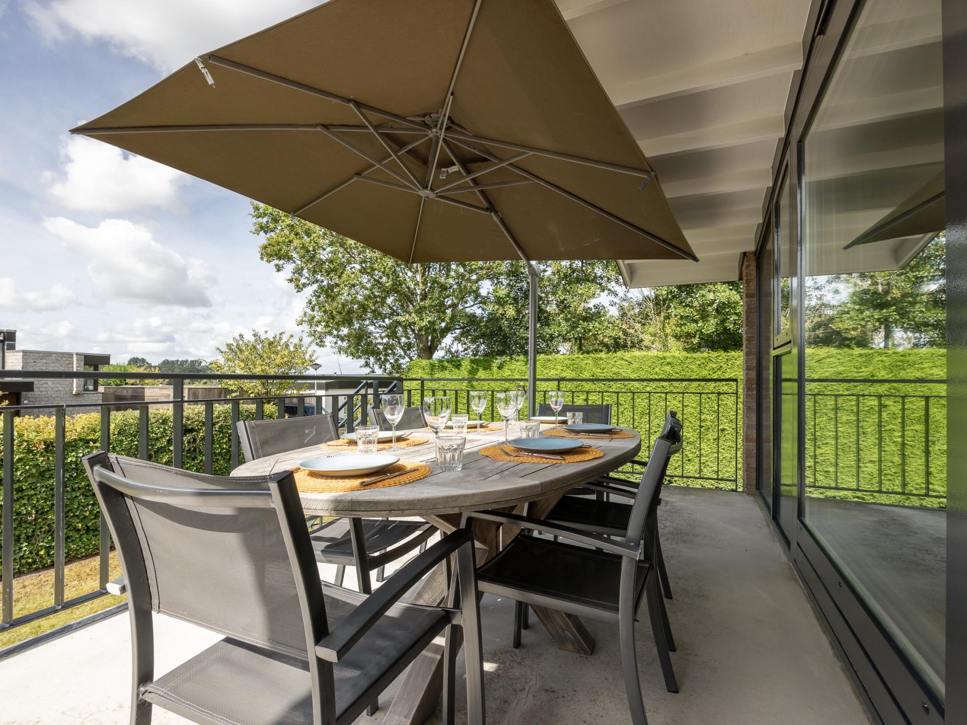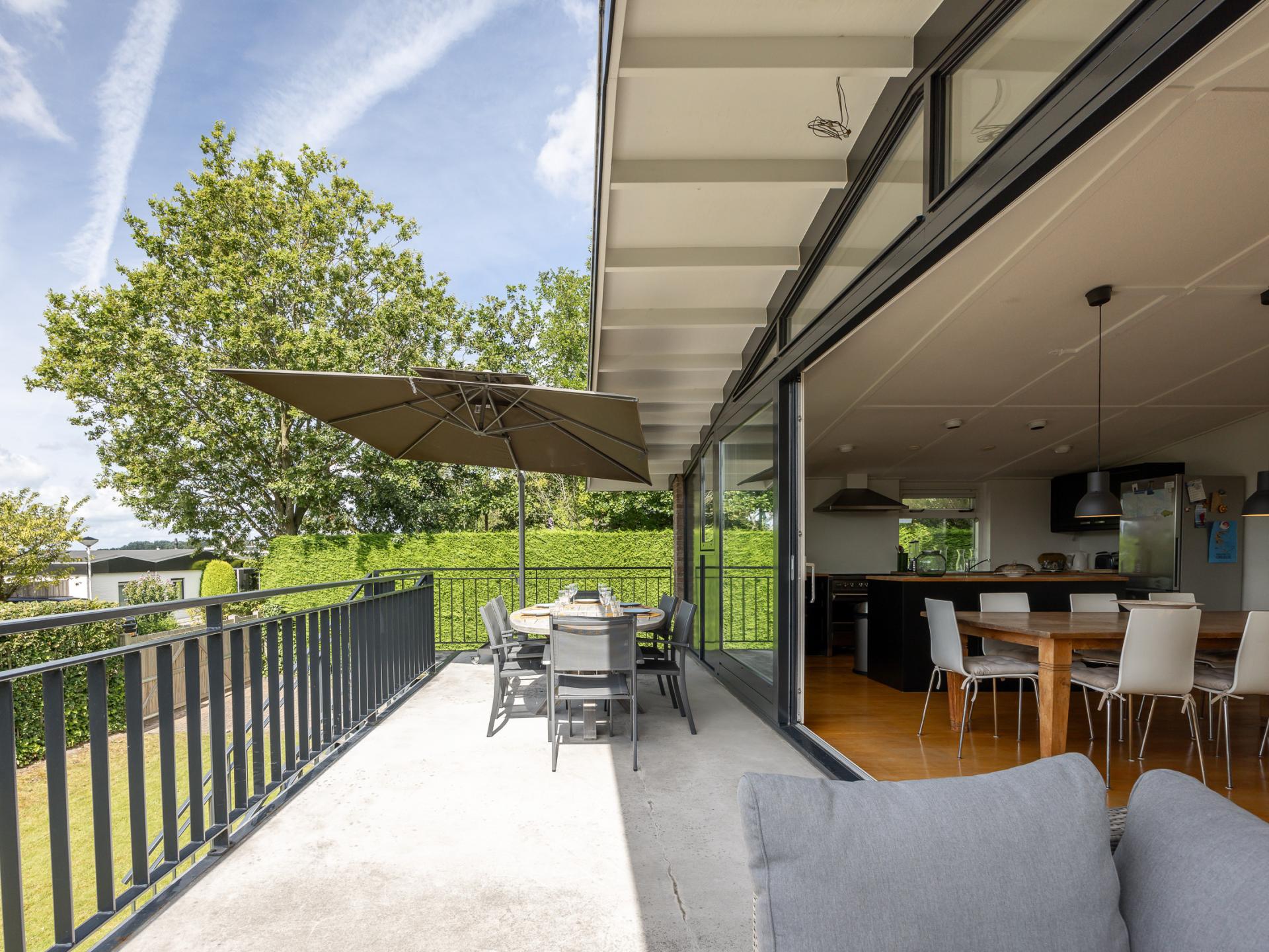 Die großzügige Terrasse mit Blick auf Veere macht diese Wohnung besonders; hier genießt man lange Abende mit Aussicht über das Wasser. Der große Garten bietet reichlich Spielraum für Kinder.