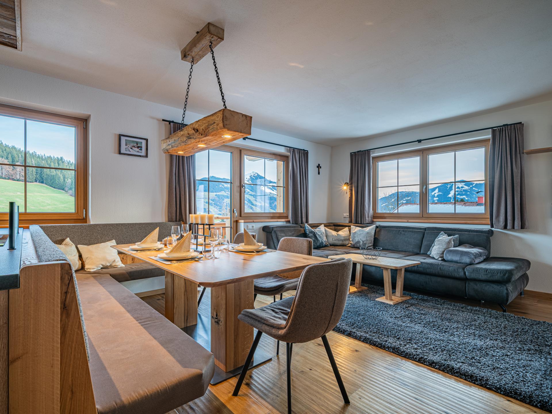 Die moderne Ferienwohnung im 2. Stock bietet alpinen Charme und viel Komfort für Familien. Zur Wohnung gehört ein Schlafzimmer mit Doppelbett; ein weiteres, separates Schlafzimmer liegt außerhalb der Wohnung im Flur und ist privat nutzbar. Ein Wohn-Essbereich mit Doppelschlafcouch, TV und offener Küche sowie Fußbodenheizung schaffen eine gemütliche Atmosphäre. Der Balkon bietet Bergblick und Privatsphäre.