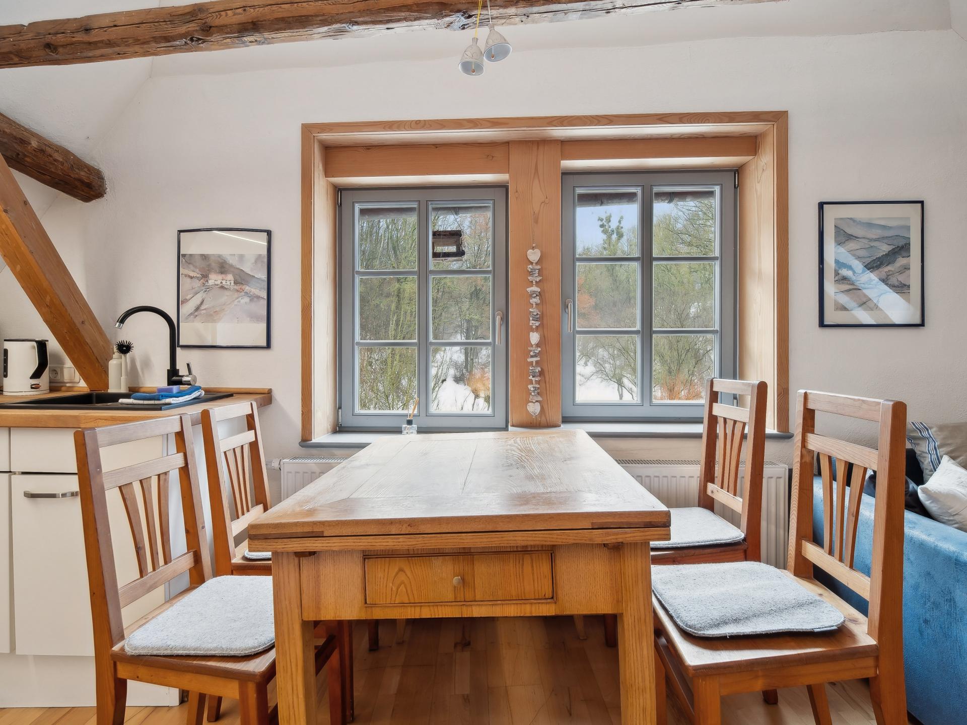 D'abord, découvrir la nature - par exemple lors d'une randonnée sur le Kyffhäuser ou d'une visite du grenier à tabac historique - et ensuite se détendre dans le sauna privé du jardin avec des fruits frais et une vue sur les vergers. C'est ainsi que l'on se sent en vacances en Thuringe.