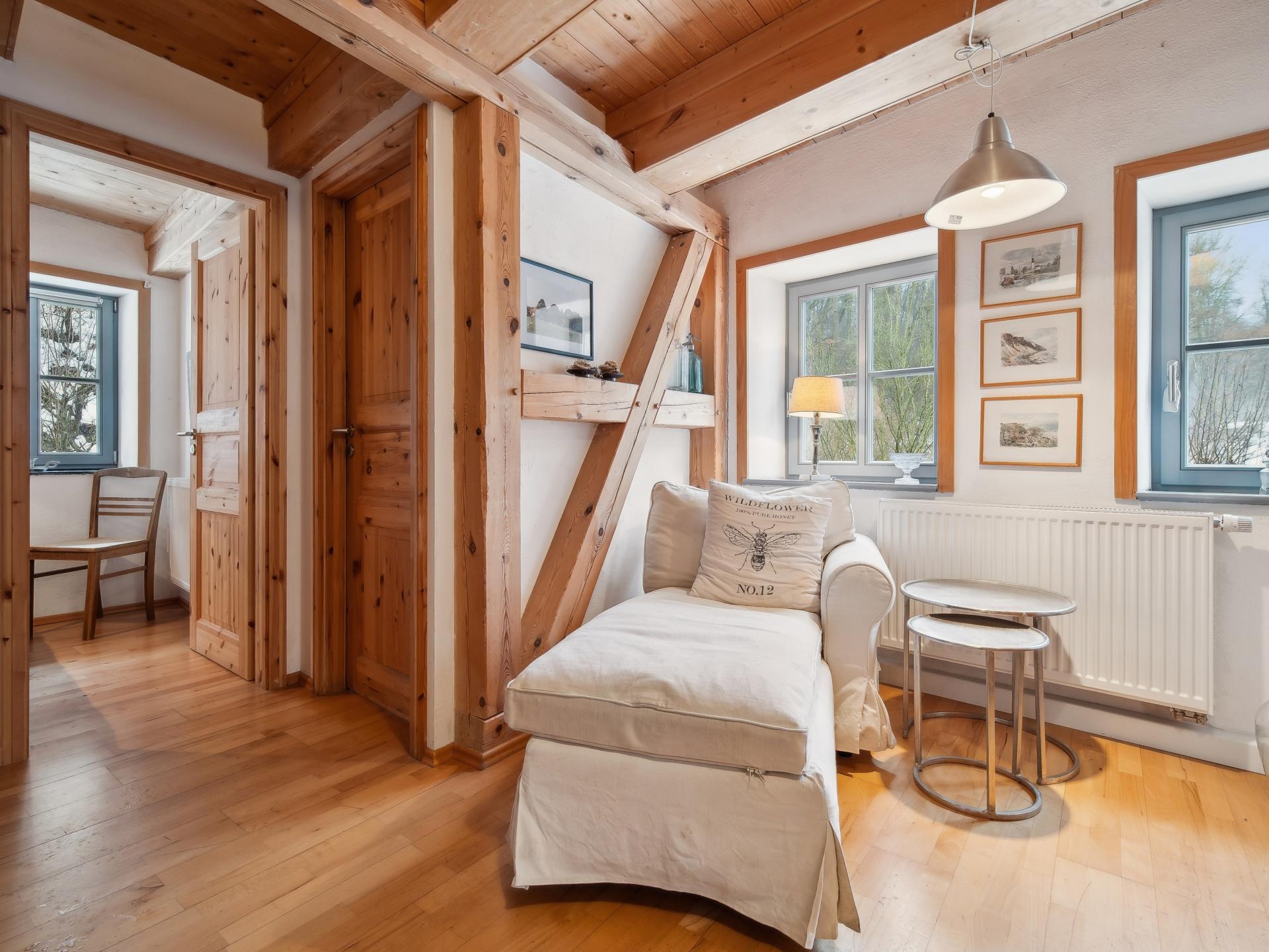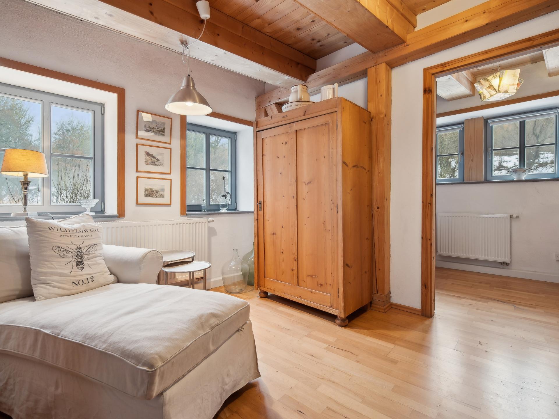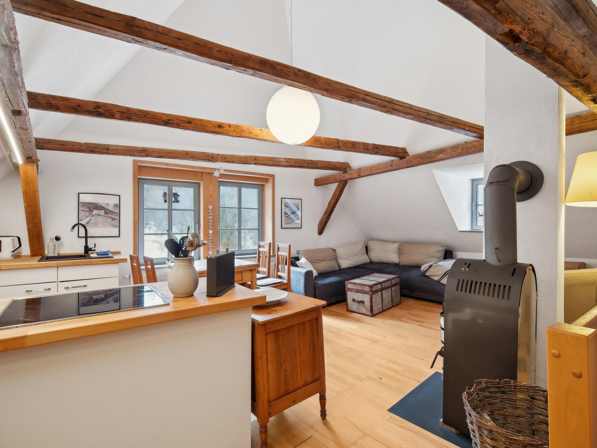 Ce gîte chaleureux se trouve à l’étage d’un moulin historique rénové avec soin. Calme, au bord d’un ruisseau, entouré d’arbres fruitiers et de prairies. En supplément, une petite maison de sauna est préparée par la propriétaire pour 2 h, avec fruits frais et boissons. Le jardin avec barbecue et le gâteau maison accompagné de café vous garantissent détente et plaisir.