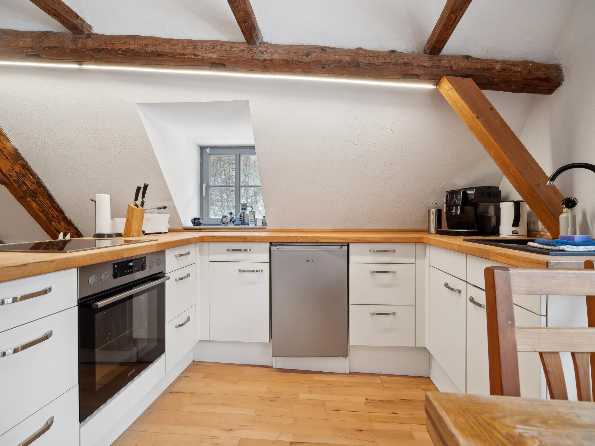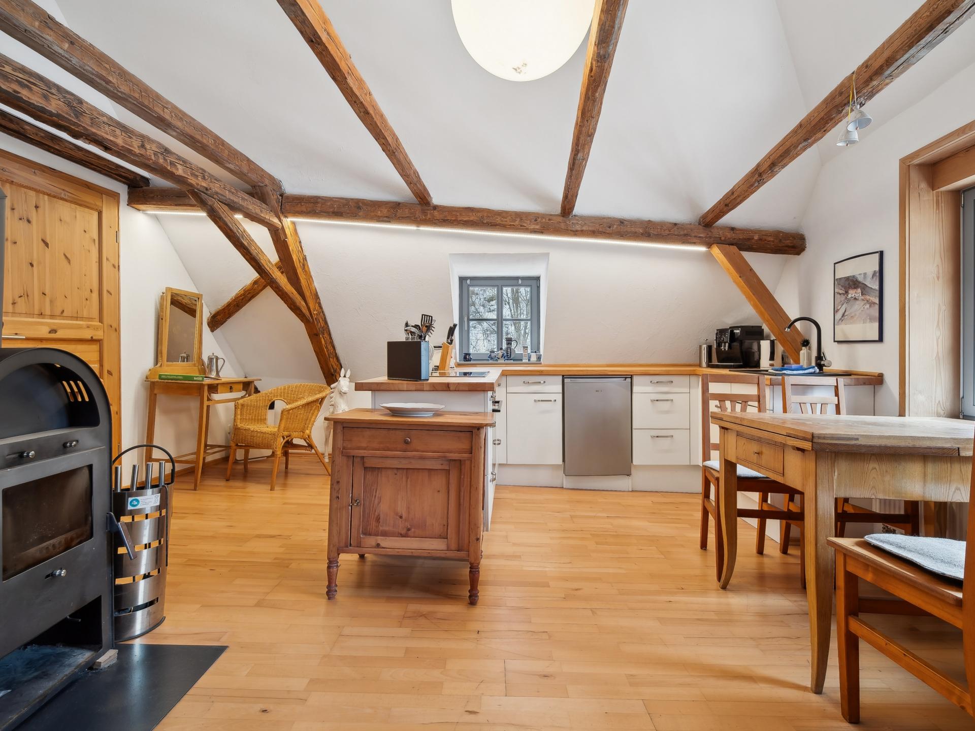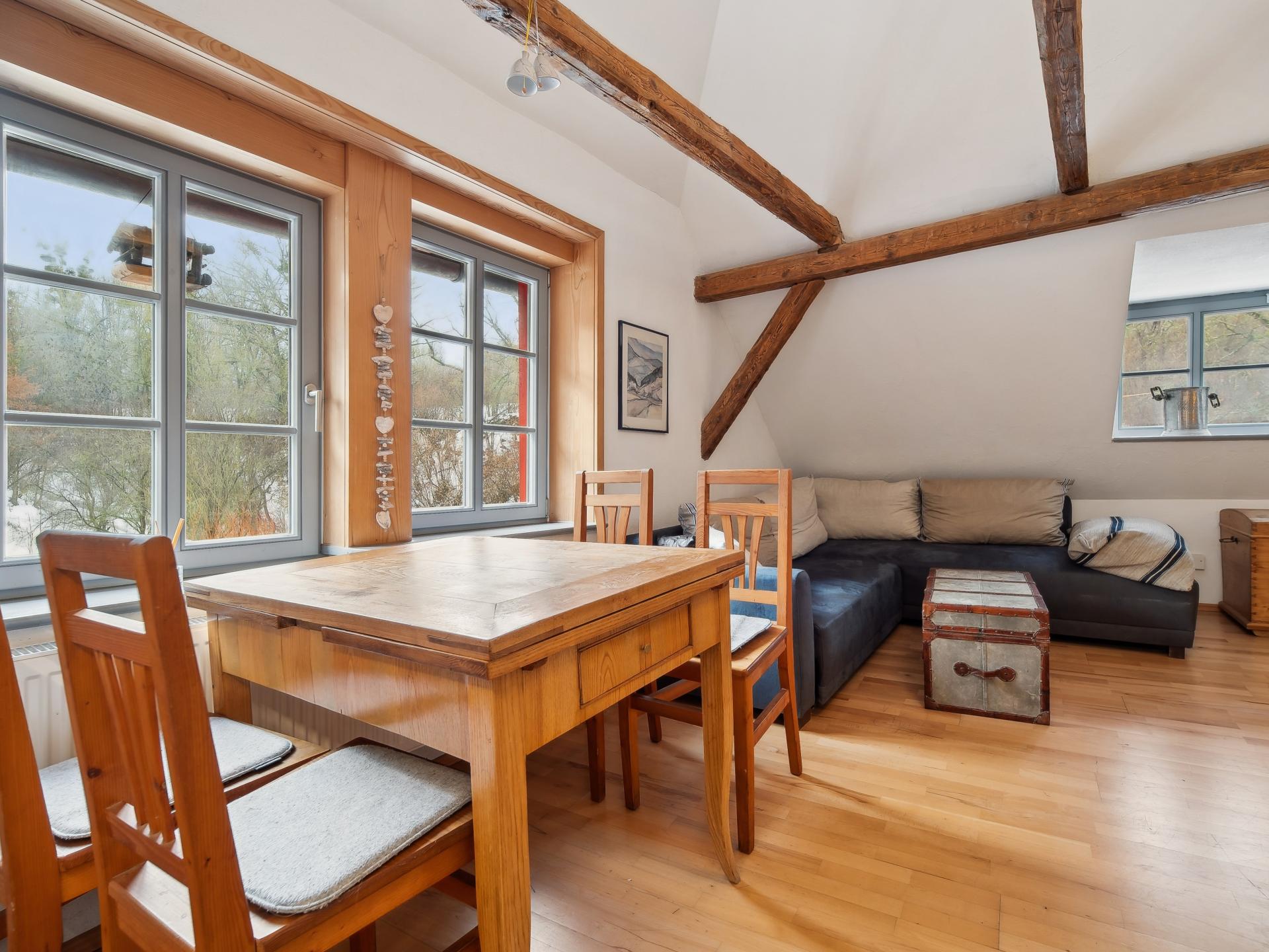 Ce gîte chaleureux se trouve à l’étage d’un moulin historique rénové avec soin. Calme, au bord d’un ruisseau, entouré d’arbres fruitiers et de prairies. En supplément, une petite maison de sauna est préparée par la propriétaire pour 2 h, avec fruits frais et boissons. Le jardin avec barbecue et le gâteau maison accompagné de café vous garantissent détente et plaisir.