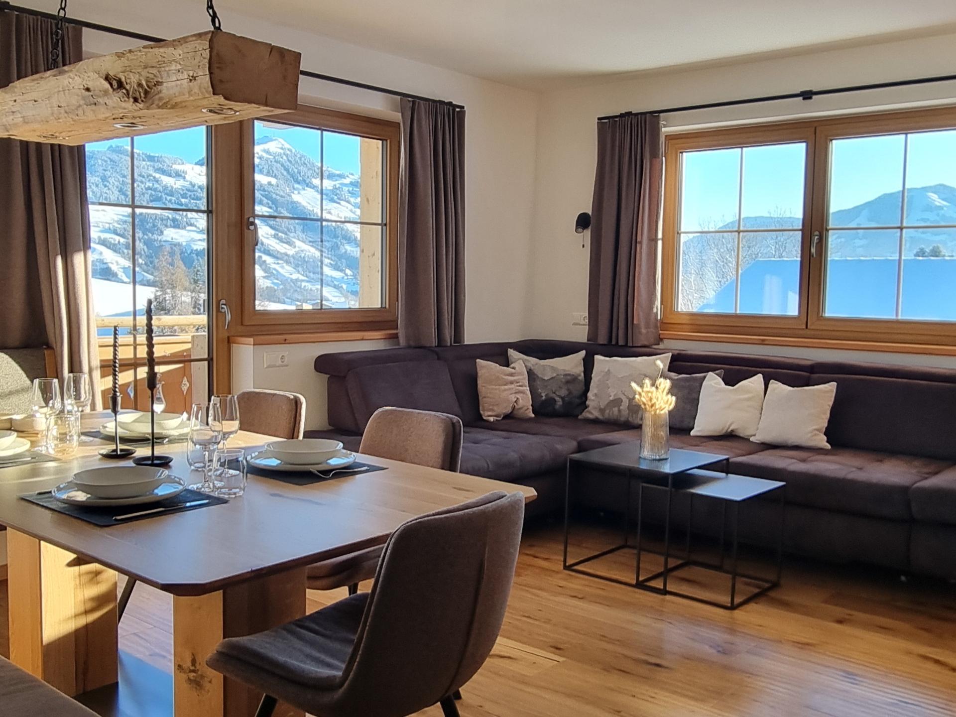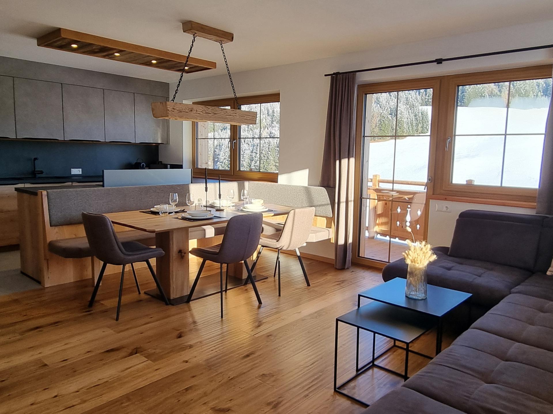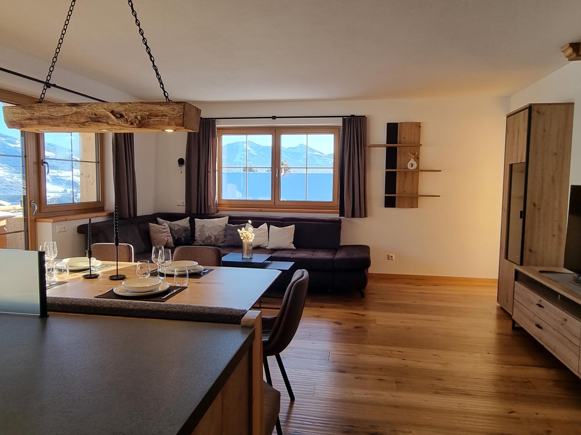L'appartement de vacances moderne au deuxième étage allie le charme alpin à beaucoup de confort et d'espace pour toute la famille. Des chambres à coucher lumineuses avec un lit double, un salon-salle à manger avec un canapé-lit double et une télévision ainsi qu'une cuisine ouverte rendent le séjour particulièrement confortable. Le mélange de bois, de couleurs chaudes et de chauffage au sol crée une atmosphère agréable, tandis que le balcon offre des vues de rêve sur les montagnes.