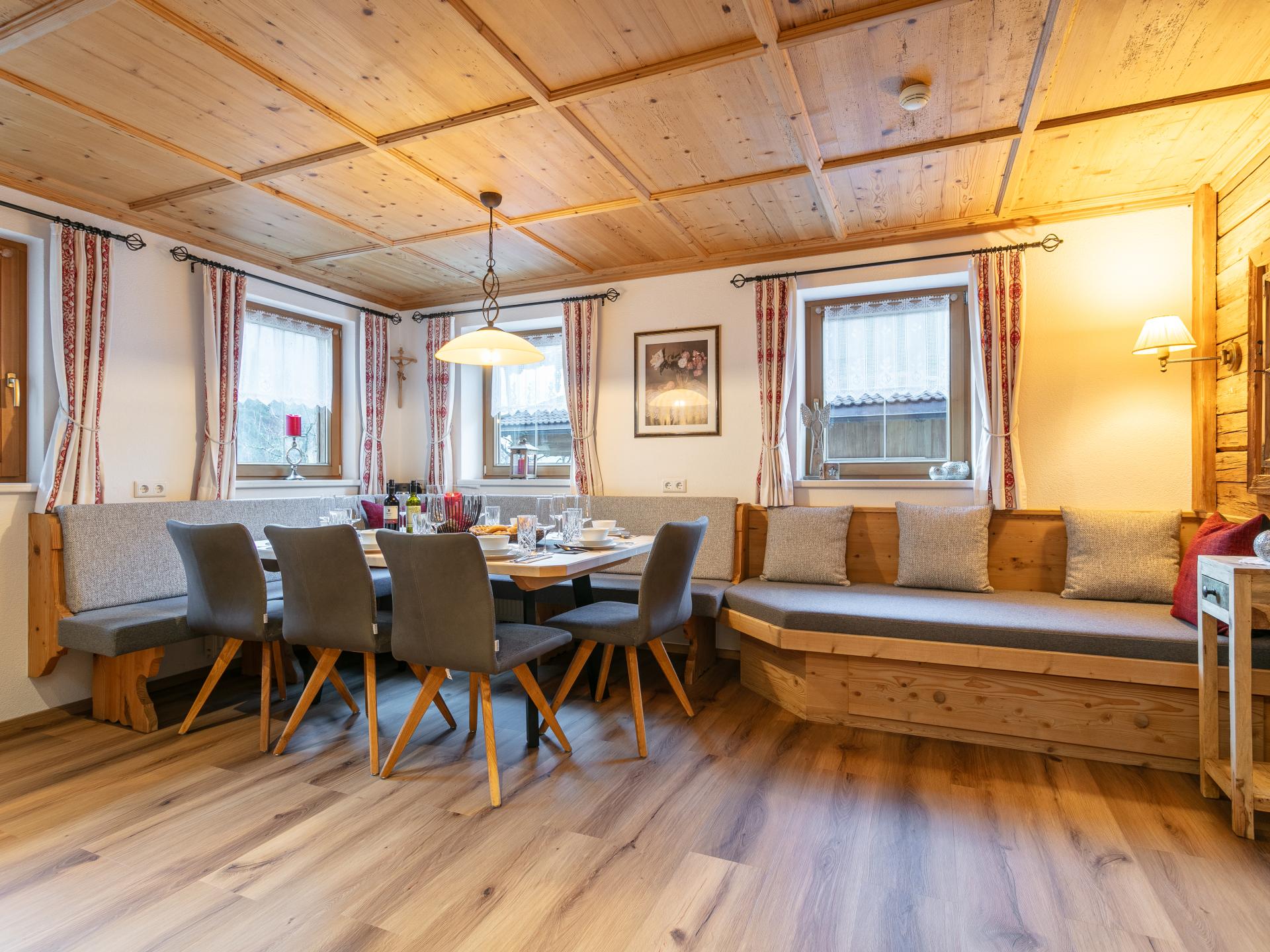 Ce chalet indépendant se trouve dans un endroit calme mais central à la périphérie de Mayrhofen/Ramsau et peut accueillir jusqu'à 10 personnes. Il est décoré dans un style typiquement tyrolien avec beaucoup de bois et offre une ambiance chaleureuse grâce à son poêle à bois. Vous vous sentirez comme chez vous dans le grand salon et les 4 chambres spacieuses. Détendez-vous après une journée de ski dans la cabine infrarouge et profitez du coucher de soleil sur la terrasse couverte en été.