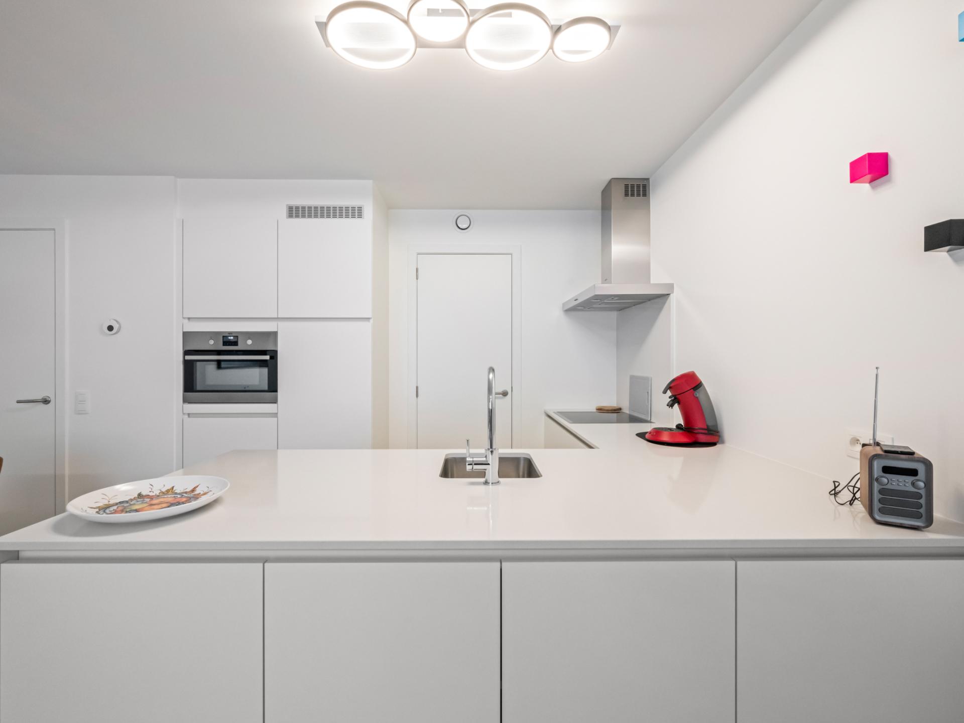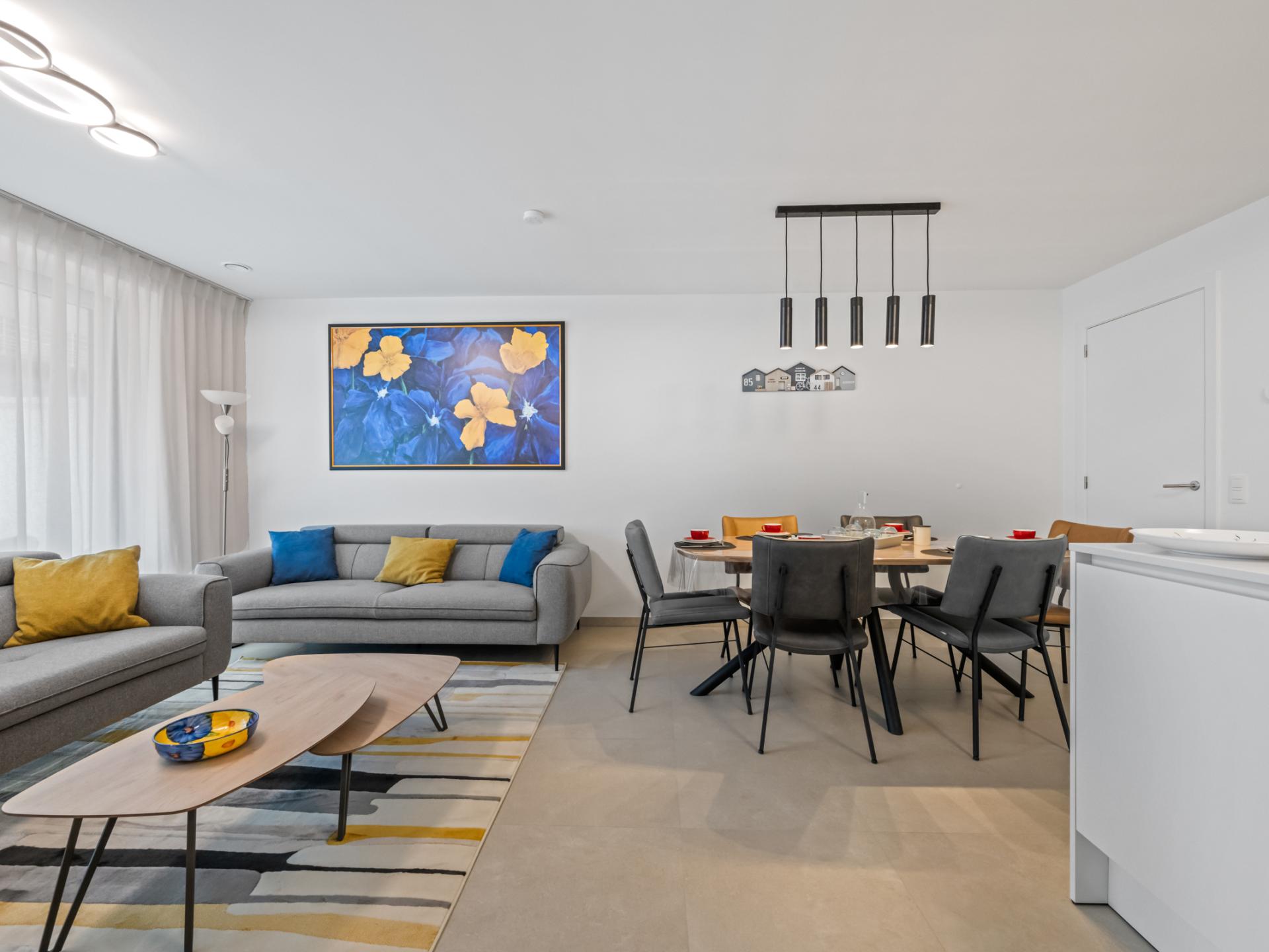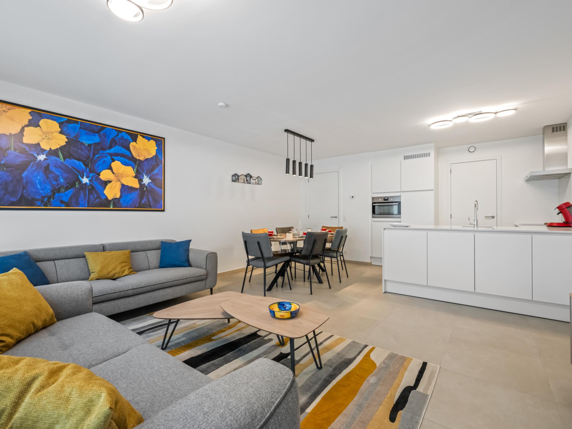 Bel appartement neuf, joliment fini, avec 2 chambres confortables, grand séjour et cuisine moderne entièrement équipée. Salle de bain avec douche à l’italienne. Grande terrasse ensoleillée à l’avant. À quelques minutes à pied de la plage, des commerces et des restaurants. Parfait pour des vacances reposantes.