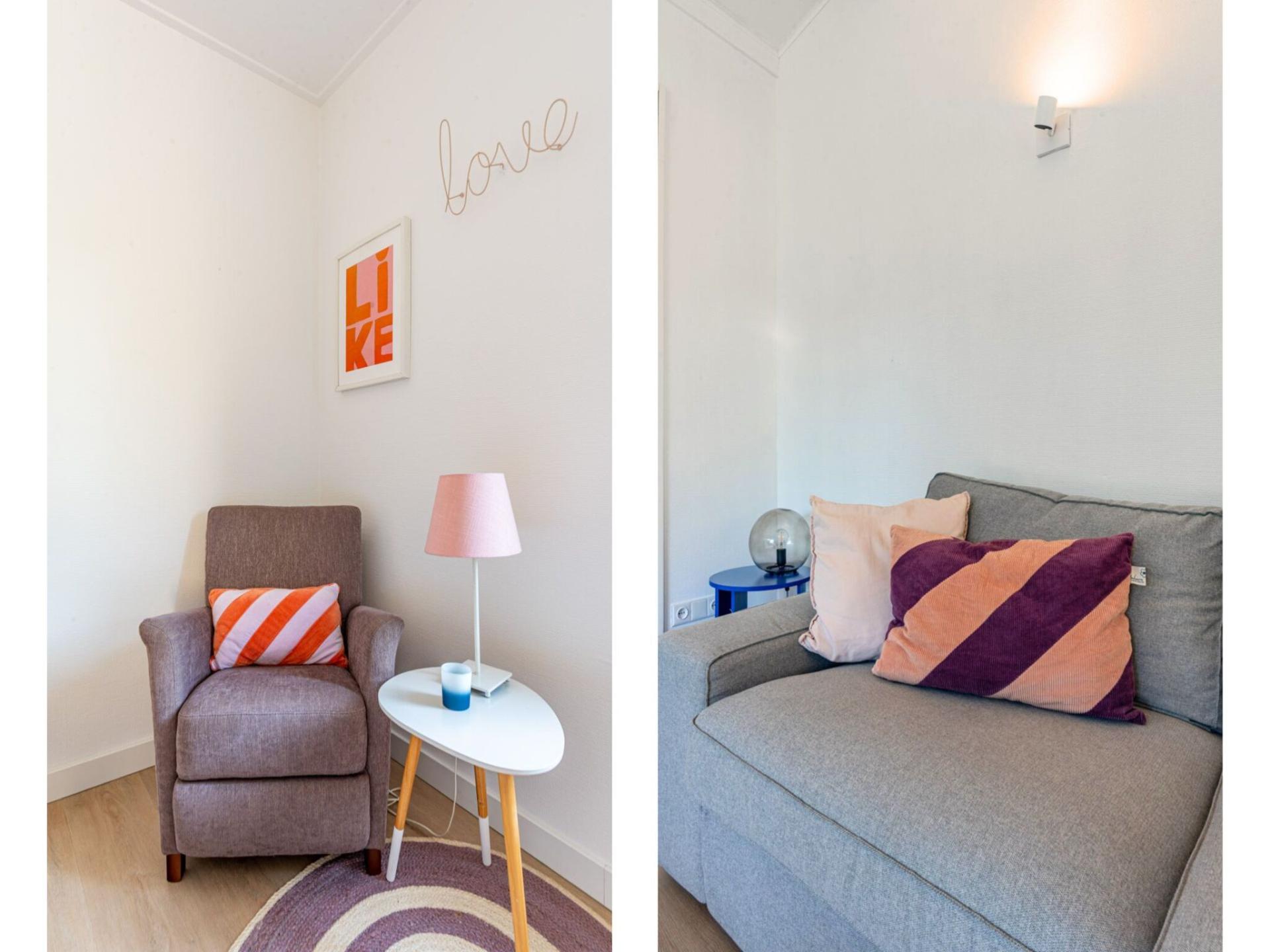 Le séjour lumineux avec deux portes coulissantes donne un accès direct au grand jardin et est joliment aménagé avec un coin salon confortable. La maison dispose de trois chambres agréables avec de bons lits et suffisamment d'espace de rangement. Il y a deux salles de bains : l'une avec baignoire, douche, lavabo et toilettes, et une seconde avec douche, lavabo et toilettes. Dans le hall, il y a également des toilettes séparées..