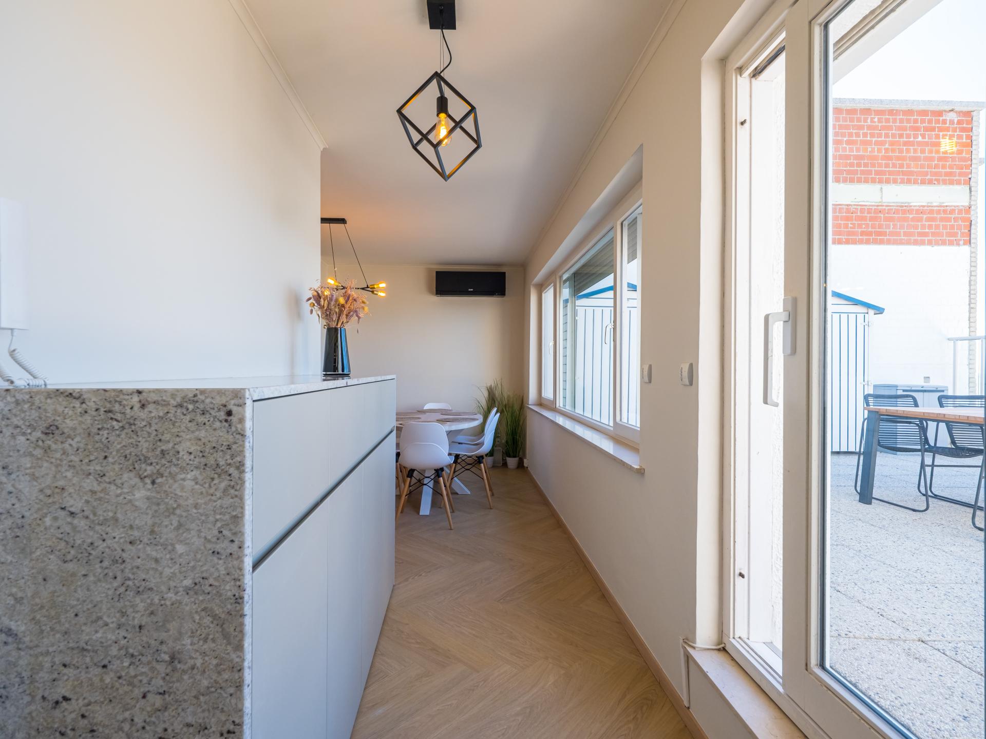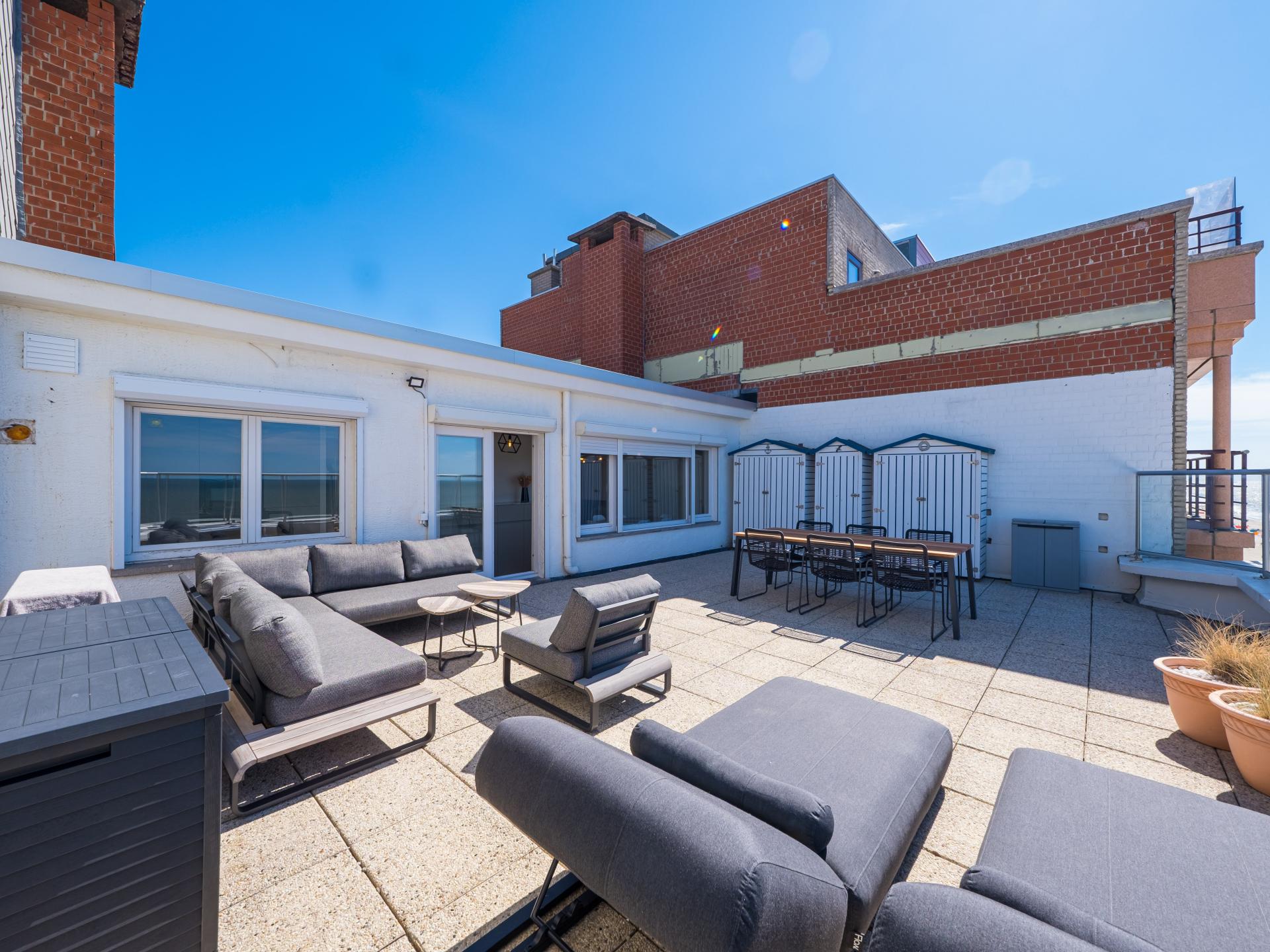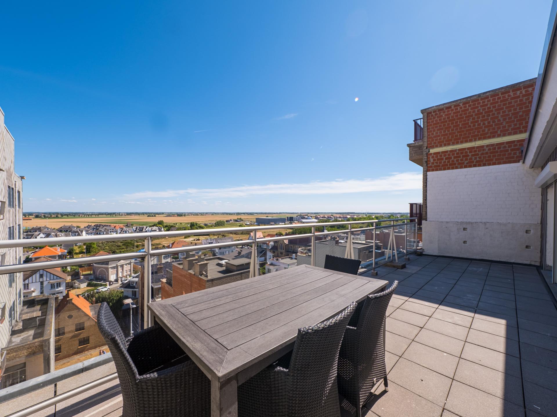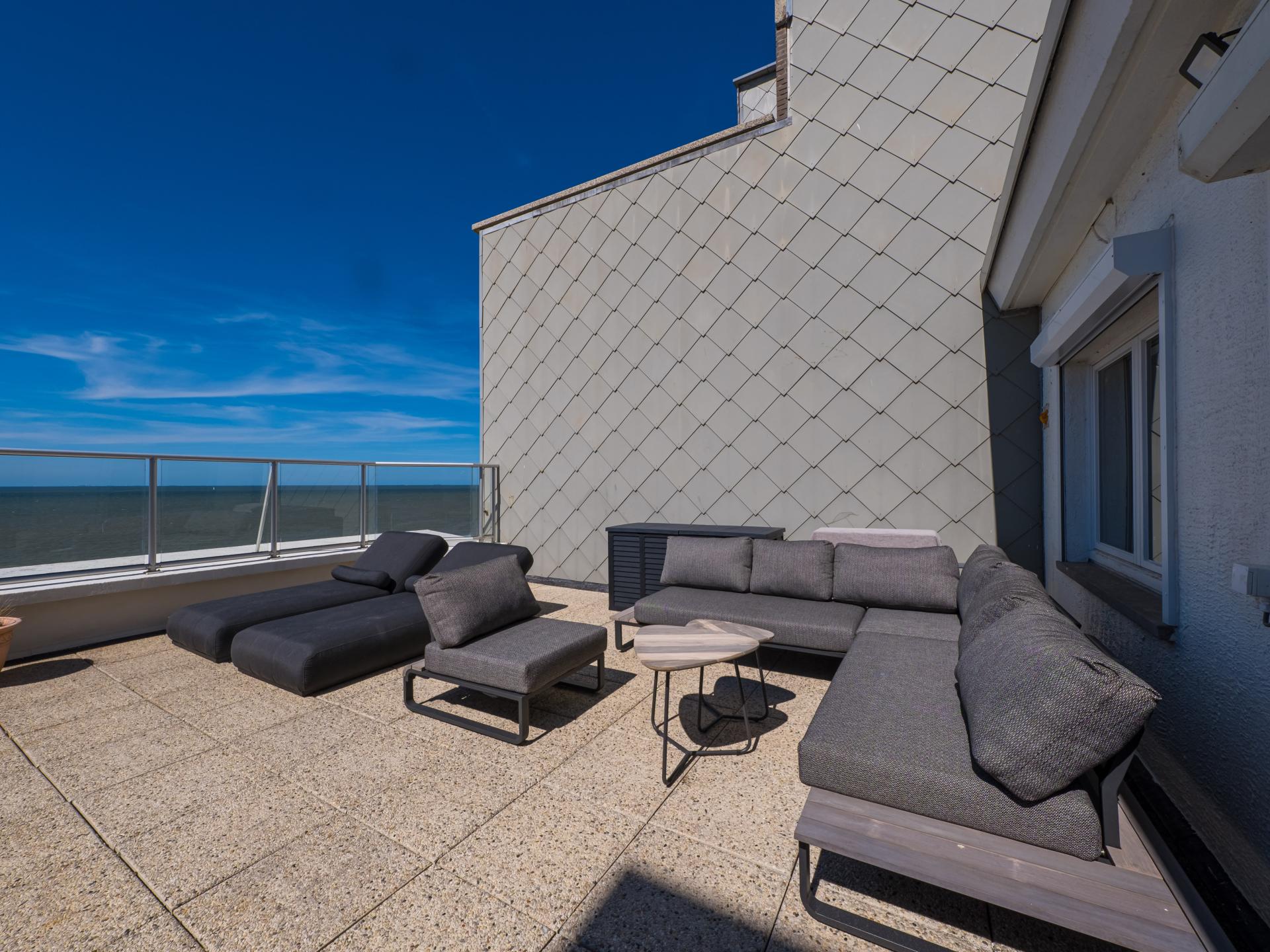 Luxe penthouse op de 8e verdieping met fenomenaal zeezicht en privé dakterras voor de mooiste zonsondergangen. Volledig gerenoveerd, met 2 ruime slaapkamers met dubbel bed en elk een zonnig terras. Lichtrijke woonkamer met panoramische ramen en directe toegang tot het dakterras. Moderne open keuken, badkamer met inloopdouche en apart toilet. Lift tot 7e, daarna enkele trapjes. Garage inbegrepen. Topligging op de Zeedijk.